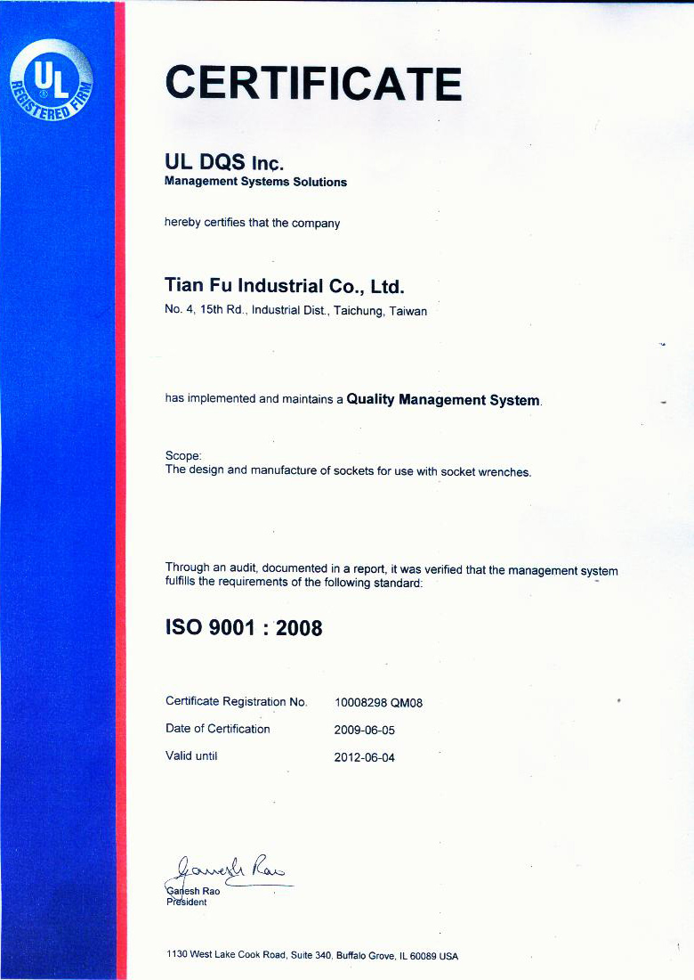 天賦工具通過(guò)了美國(guó)UL認(rèn)證,符合iso9001:2008的各項(xiàng)包括設(shè)計(jì)、制造、安裝和服務(wù)系統(tǒng)。