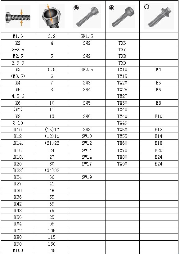 螺栓與套筒扳手尺寸對(duì)照表(括號(hào)中的尺寸為GB舊標(biāo)準(zhǔn)尺寸)